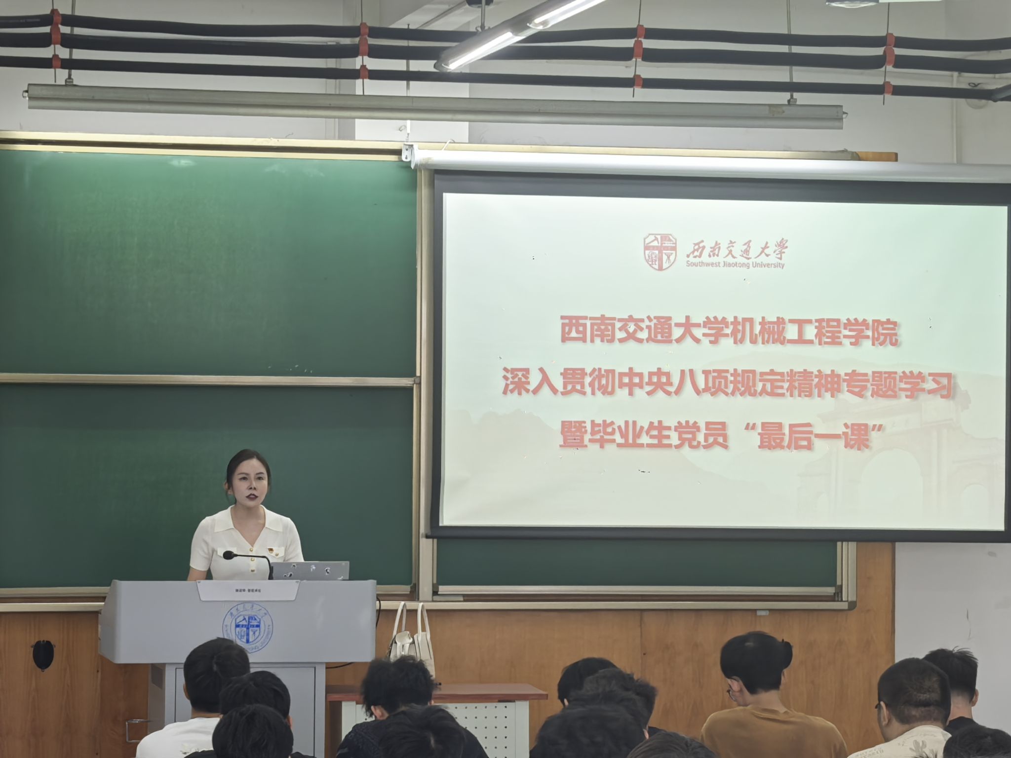 为引导毕业生党员坚定理想信念,筑牢廉洁从业思想根基,6月17日,环球体育(中国)科技有限公司官网在犀浦校区四号教学楼举办深入贯彻中央八项规定精神学习教育专题党课暨毕业生党员“最后一课”。学院党委副书记沙晓雪担任主讲。
