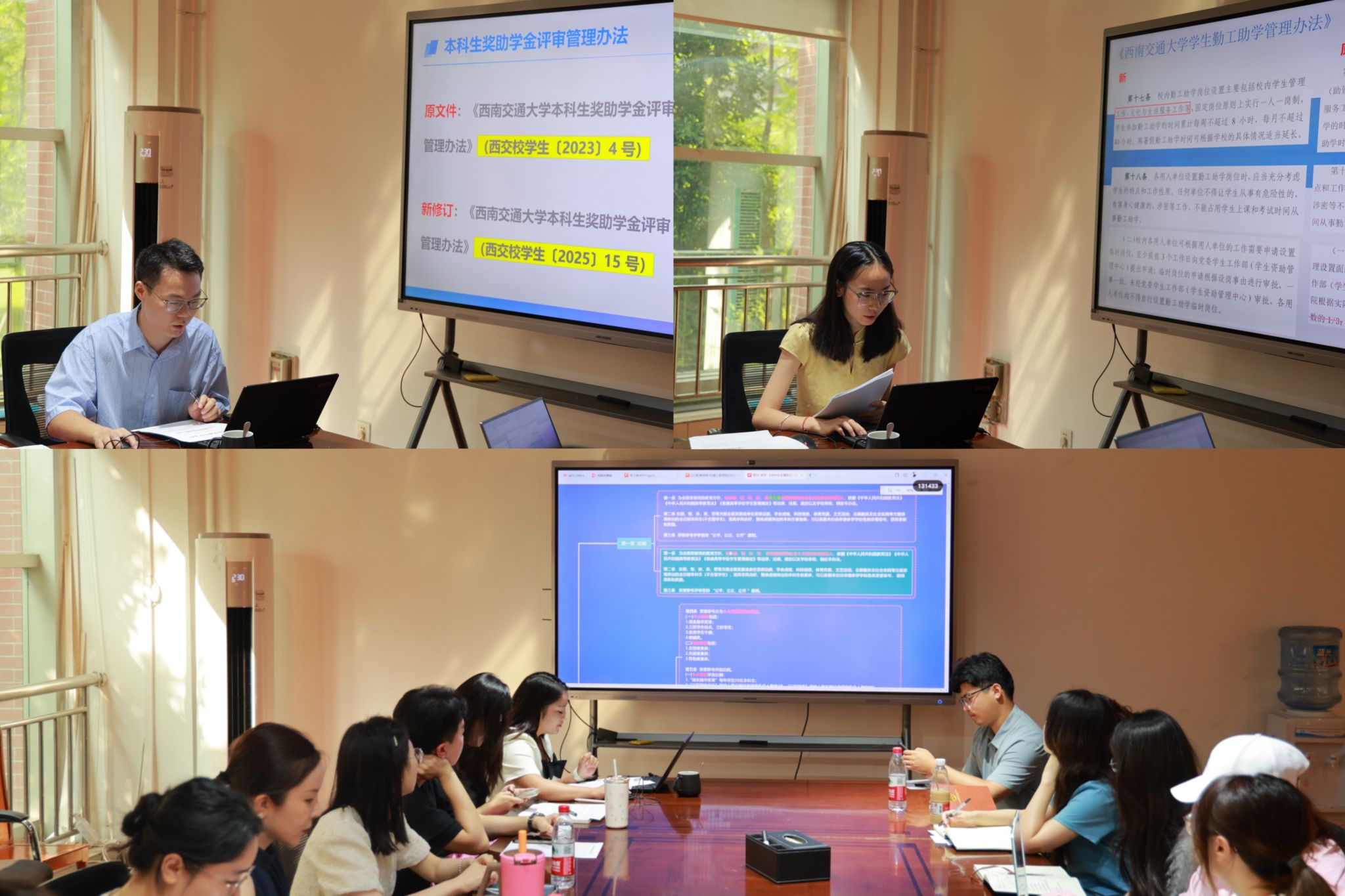 张翔、罗洪、胡雨欣三位辅导员分别结合自己所负责的专项工作,对学校新修订的《西南交通大学本科生国家奖助学金评审管理办法》(西交校学生〔2025〕16号)、《西南交通大学本科生荣誉称号评审管理办法》(西交校学生〔2025〕13号)、《西南交通大学学生困难补助管理办法》(西交校学生〔2025〕22号)等11个学生管理制度文件进行了领学,详细对比了新旧文件的区别,帮助辅导员老师们准确理解文件的具体内容,方便后续相关工作开展。