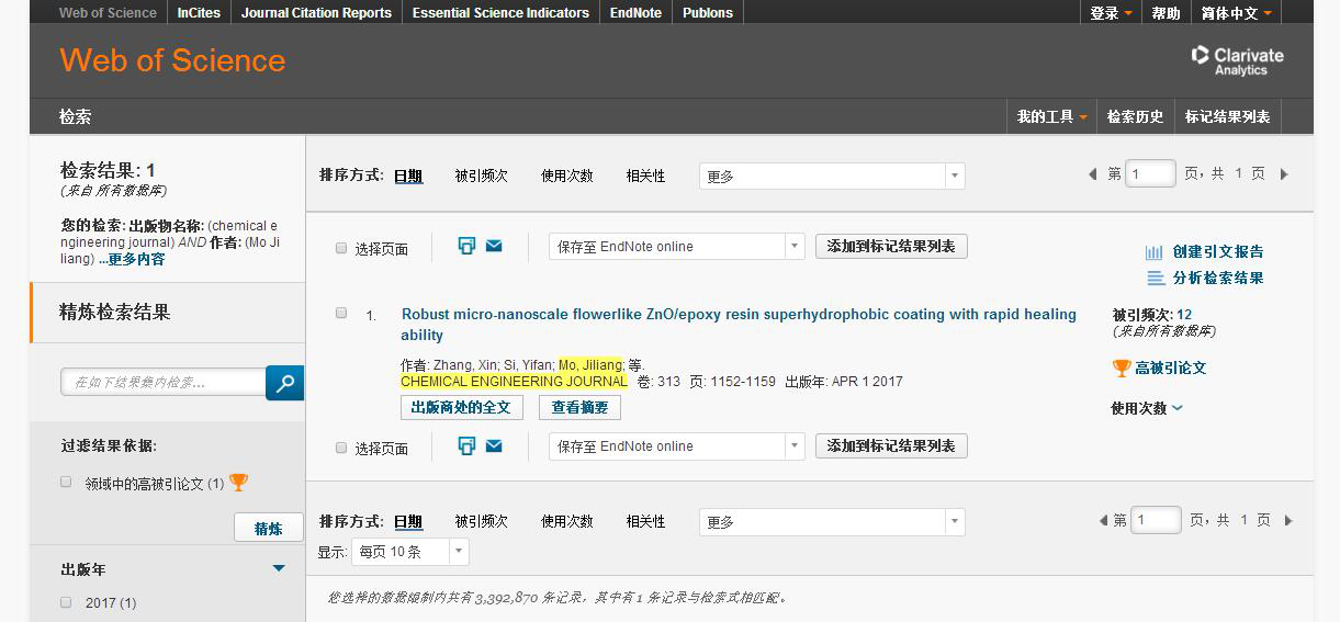 根据美国科技信息所(ISI)基本科学指标数据库(ESI)最新数据显示,我院硕士研究生张鑫(其导师为摩擦学研究所莫继良研究员)于2017年4月在《CHEMICAL ENGINEERING JOURNAL》(影响因子:6.216)上发表的第一作者论文“Robust micro-nanoscale flowerlike Zno/epoxy resin superdrophobic coating with rapid healing ability”入选ESI“高被引论文”。
