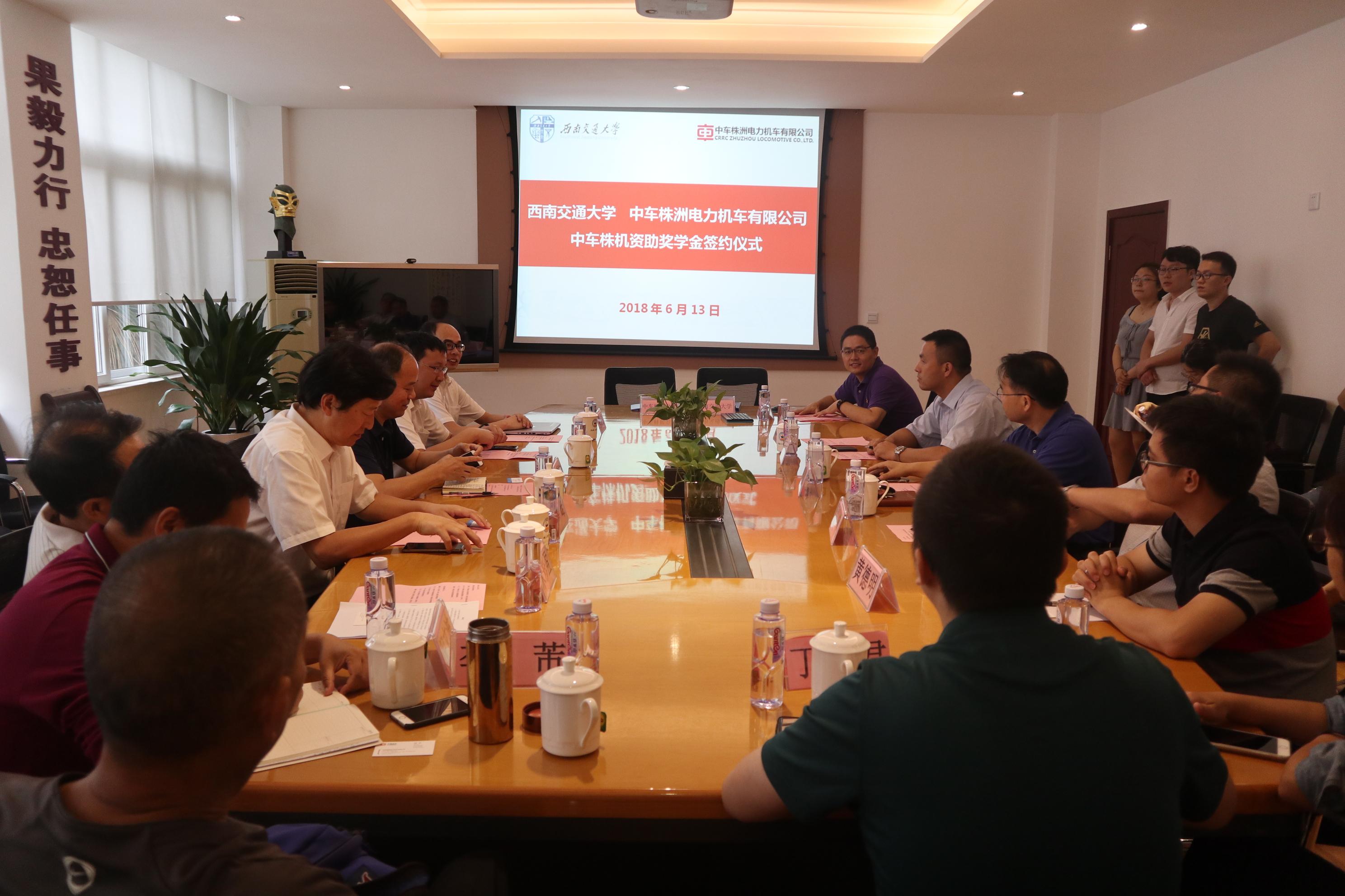 2018年6月13日上午9时,中车株洲电力机车有限公司向西南交通大学捐赠30万元人民币设立“中车株机资助奖学金”的签约仪式在西南交通大学九里校区机械馆2206会议室成功举行。出席签约仪式的有:中车株机公司纪委副书记、株机公益基金会理事长文国元,中车株机公司公益基金会副理事长、秘书长赵雄,中车株机公司人力资源部副部长吴艺,中车株机公司科技管理部副部长王湘银,环球体育(中国)科技有限公司官网院长钱林茂教授,校对外合作与联络处副处长、教育基金会副秘书长潘昱,校学生工作部副部长宋刚,以及电气工程学院和材料科学与工程学院相关老师。仪式由环球体育(中国)科技有限公司官网党委副书记李毅主持。