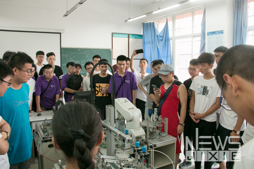 遍历一楼之后,同学们上到了二楼继续参观。进入现代生产过程自动化实验室之后,同学们的热情被完全点燃。大家围作一团,眼里似乎不断有光芒溢出,来回打量着这精巧、复杂却又让人莫名喜欢的自动化生产线。小巧的机械臂、与之配合默契的升降台,运动一直在重复,可同学们却不愿迈步离开。