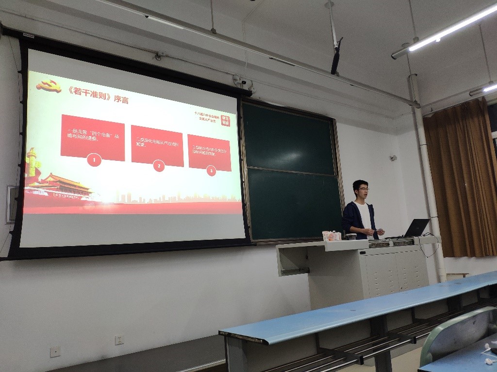 会上,曹奥同志从《准则》的修订背景、内容解读以及重要意义等方面,带领全体党员进行了深刻地学习与研讨,共同认真学习了《准则》的重要内容。作为学生党员,首先要坚定理想信念、坚持党的基本路线、坚决维护党中央权威,;其次,对于担任学生干部的党员同志,要保持与同学的紧密联系,立足校园,服务同学,切忌脱离实际、脱离群众;第三要严格党的组织生活制度、不定期开展批评与自我批评,规范党内政治生活。会上,党支部支委也向与会同志征求了对于支部改进的意见与建议,为把支部建设得更好而奋斗.