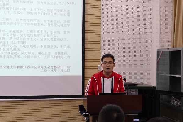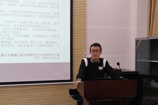 接着学生干部纷纷上台指出自己的不足之处并对自己提出更高要求。研会主席赵建岗同学指出自己在学生工作方面还存在不足之处,由于时间精力等问题在某些工作上还有很大提升空间,他表明在今后的工作中,自己必定放低状态,尽心尽力地为学院同学们贡献出自己的力量;副主席关宇涵提到学生干部有时会被误解为“键盘侠”,但他同时提到学生干部不能因为被误解就产生负面情绪,应该不忘初心,牢记为同学服务的初心,尽量做好自己,为更多的同学服务。