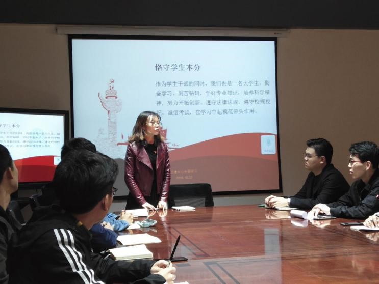会议伊始,指导老师邓慧心带领大家朗读了学生干部作风相关守则,并就守则记录发表了自己的看法。邓慧心老师强调:“学生干部在大学中应以学习为主,应起模范带头作用,要树立为同学们服务的良好工作态度”。