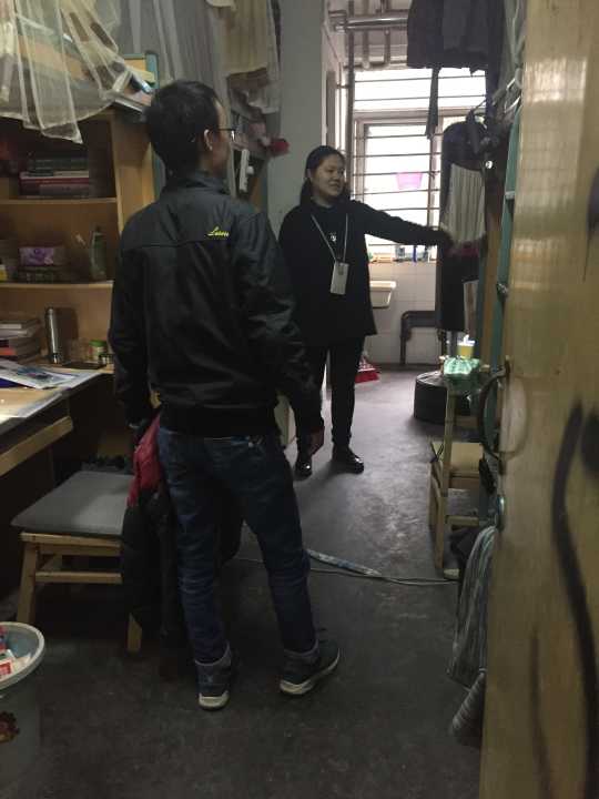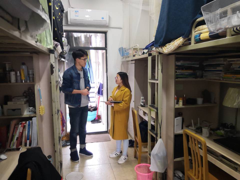 经检查,宿舍整体情况良好,无违章电器,部分寝室卫生情况好,物品堆放整齐。但部分寝室由于物品较多,堆放杂乱,部分寝室存在电线缠绕在床头、电线杂乱堆放在书桌、插头长期与插线板连通、寝室存放大量纸箱等情况。对于存在安全隐患的寝室,辅导员对学生进行了指出,并指导学生立刻整改,将安全隐患消灭在萌芽状态。
