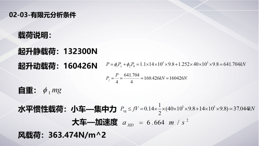 3.确定有限元分析条件。如单元的选择、划分方法、材料、工况、约束条件以及简化条件的确定。期间建立门架结构三维模型,确定门架结构质量和迎风面积,进而确定大车水平惯性加速度和面均布风载荷的大小。