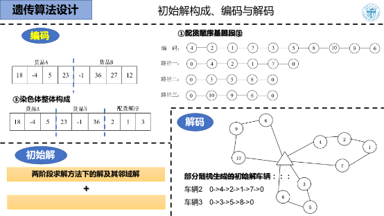 为了较为清晰简洁地说明本文启发式算法的设计过程,以下将以图片形式进行简要说明。遗传算法主要包括初始解群体生成、适应度值计算、选择操作、交叉操作及变异操作等步骤,经过多次迭代,形成最终解。