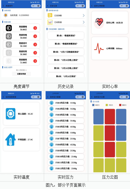 该微信小程序可以实现多种功能,包括上传数据到数据库,从数据库中拉取数据;与单片机通过BLE蓝牙设置建立通讯;获取单片机传过来的传感器的实时数据并显示在相应界面;个人中心界面以及配套的各种小功能,历史查询,床位绑定,客服,地图查看等;亮度调节,图片查看,视频查看,发送弹幕4等;查看当日睡眠报告,查看周报等;蓝牙控制单片机等。除了以上的导航栏主页面,在每一个页面下还有很多子页面,在这里展示部分子页面,组图如下图图九: