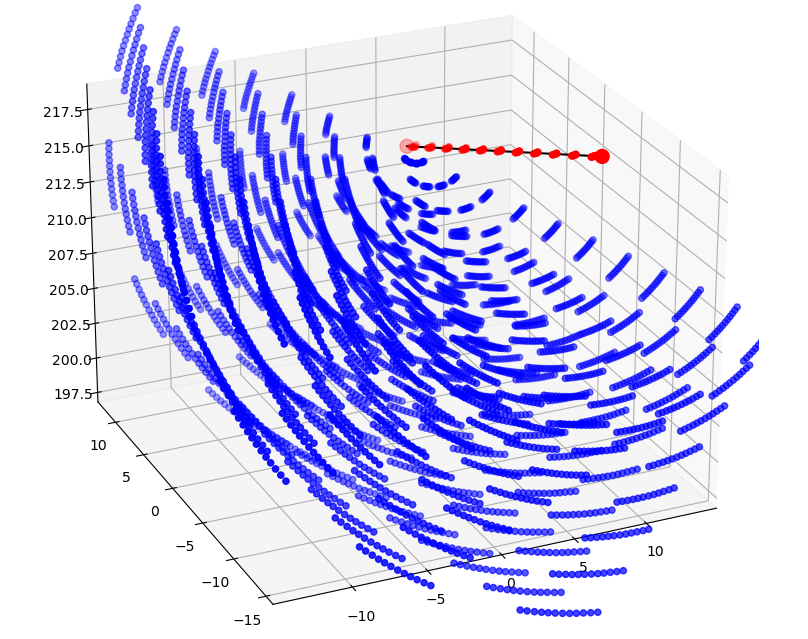 相机标定采用张正友标定法,可求出相机内部参数,即像素坐标到相机坐标系的转换矩阵;光平面标定通过多组拍摄激光照射在棋盘格上的图片,求出线激光光源产生的光线平面在相机坐标系下参数,结果如图3所示,其中红色为光条纹点集,蓝色为拟合的光平面;旋转轴标定同样通过拍摄多组棋盘格绕转台旋转的图片,通过拟合圆心以及最小二乘法求出转台的旋转轴在相机坐标系下的直线方程,结果如图4所示,图中蓝色点为棋盘格内角点,红色点为拟合的圆心。