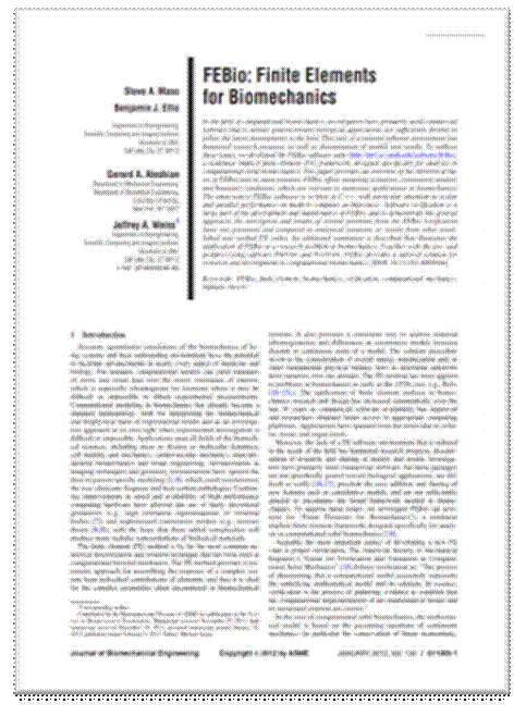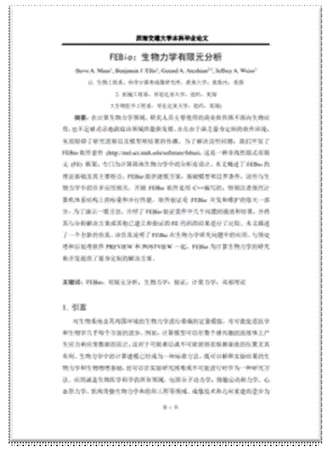 (2)完成了对外文文献的翻译。文献标题为:FEBio: Finite Elements for Biomechanics,是由美国犹他大学生物工程系Steve A. Maas、Benjamin J. Ellis等人编写并发表在 上的一篇期刊论文。该论文主要介绍了一款由美国犹他大学研发的专注于生物力学的开源有限元分析软件FEBio的理论知识、具体功能以及实际应用,包括其与NIKE3D、ABAQUS分析结果的对比。其中FEBio软件为本论文进行生物有限元分析的主要软件。