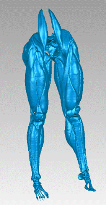 (6)对获取的人体下肢模型进行数据处理与转换。首先通过Geomagic软件是对从网站获取的130多个骨骼、软骨、韧带以及肌肉STL模型进行去噪点、网格修复、实体编辑等处理获取IGS格式的实体模型。之后将处理好的IGS实体模型导入Hypermesh软件进行有限元网格划分以及优化,并在检查网格质量后导出.inp文件,为后续导入FEBio软件进行有限元分析做准备。