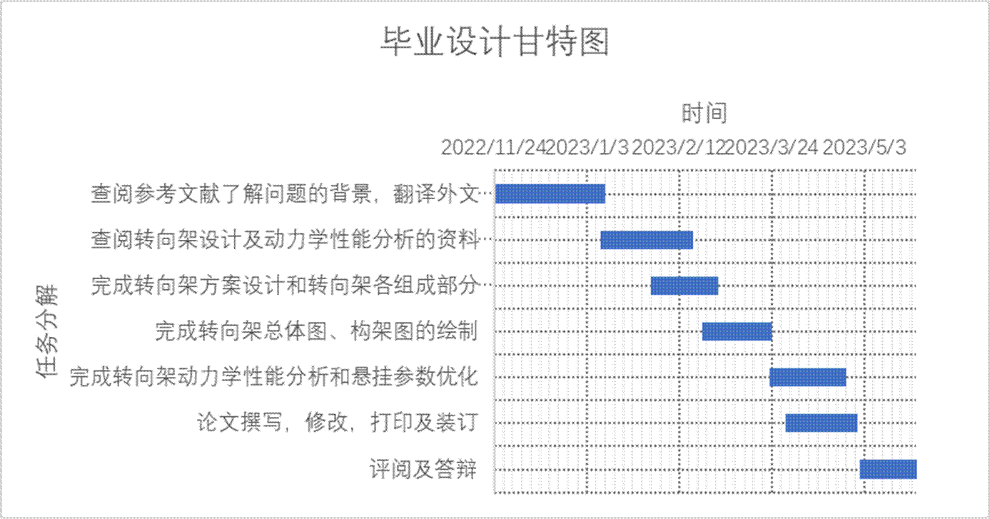 本选题要求提出曲线通过性能优良的内轴箱悬挂工程车辆转向架,对转向架的动力学性能进行分析,对悬挂参数进行优化,并规范绘制转向架工程图和撰写设计说明书。选题的各项任务可以分解为如下子任务: