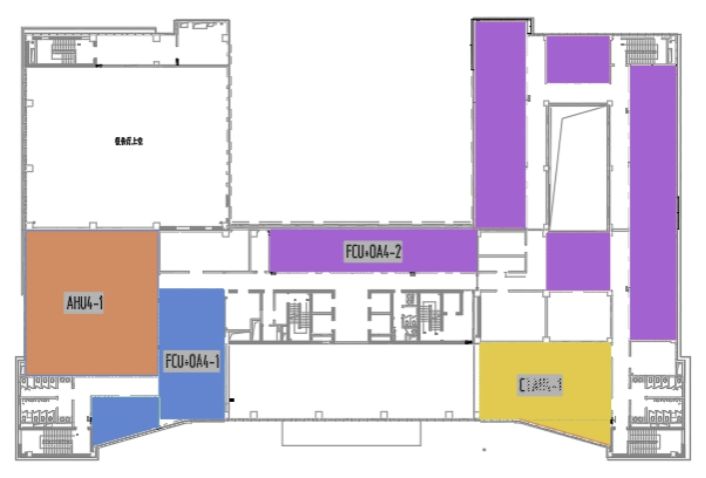 办公室是本建筑中一个重要的组成部分,办公室基本位于建筑外区独立房间,面积较小,数量较多,需要根据个人冷热感觉进行多档独立调节,且需满足工作人员在不同时间启用的自用需求。基于此,本设计为办公区选择风机盘管+独立新风空调系统。根据各个办公室的室内负荷,在房间内布置相应数量的风机盘管承担全部室内负荷;新风则分区域由风井或侧墙新风口集中引入,经吊顶式新风机组处理后,再由新风管道送至每个房间,与回风混合后送入室内。