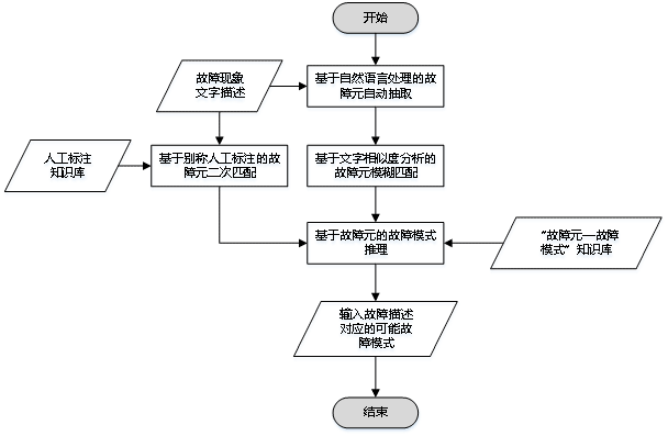 其中步骤4)输入为“故障描述——故障元”自动、人工匹配结果和“故障元——故障模式”知识库,输出为基于故障元的“故障描述——故障模式”推理匹配结果,即输入的故障现象描述对应的可能故障模式