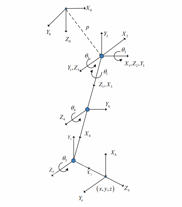 本课题研究设计的下肢外骨骼机器人模型,基于人机耦合性的考虑,对人体下肢进行姿态仿生,选取髋关节三个自由度、膝关节一个自由度、踝关节一个自由度。尺寸上参考《中国成年人人体尺寸》中1.754m成年男性身体数据。运用标准D-H法对下肢外骨骼进行运动学模型的抽象,所设计研究的下肢外骨骼机器人有5个自由度,需要建立6个坐标系来进行描述,为了简化后续计算,在计算程序编制上将第一个关节坐标系与基坐标系重合。