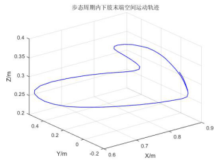 将整个系统的相邻的变换矩阵按照编号进行依次右乘,就可以得到最终的变换矩阵,根据数学分析,该矩阵的前三行的最后一列元素分别对应的是系统末端对于固定坐标系即空间的三维坐标x,y,z。本课题的下肢外骨骼机器人的矩阵具体表达式过于冗长,在此不再赘述,矩阵计算运用MATLAB可以很快进行求解。以CGA曲线中的各关节角作为输入,求解出末端位置的空间变化即为正运动学问题。运用Robotic Toolbox中的相关封装函数以及MATLAB基本函数与循环,可以写出计算程序对末端轨迹进行计算、保留与直观绘制。