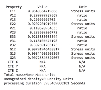 在Abaqus中施加点对点式周期性边界条件(PBC),以均匀化的方式计算出纤维束的各个方向弹性模量(单位为GPa),结果如图所示。