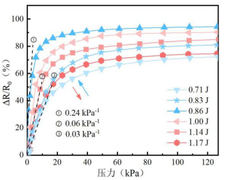 首先对不同刻蚀参数下的压力传感器的压敏曲线进行测试,结果表示,不同的激光刻蚀参数下,压力传感器的灵敏度和传感范围也不同。如图15所示,LIG压力传感器的灵敏度范围为0.03~0.24 kPa-1,传感范围为20~60 kPa(S > 0.002 kPa-1),电阻变化率最高可达到94 %。随着相对激光能量的升高,压力传感器灵敏度先升高(0.71~0.86 J),而后逐步降低(0.86~1.17 J),这或许是由LIG中不同级别的结构起主导作用引起的。