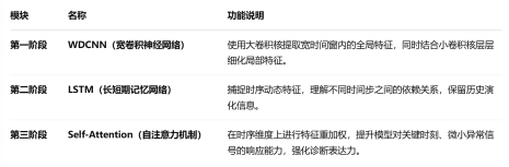 (2)模型结构设计与实现:在多轮实验探索的基础上,设计并实现了基于(1DCLA模型)WDCNN + LSTM + Self-Attention的混合模型结构如图3所示:WDCNN模块通过宽核卷积提取低频与局部故障特征,采用多层卷积与池化操作逐步加深网络;LSTM模块用于建模时间序列中的长依赖关系,捕捉设备运行状态的演化过程;Self-Attention模块进一步强化模型对关键时间片段的关注能力,从全局层面对时序特征进行加权聚合。
