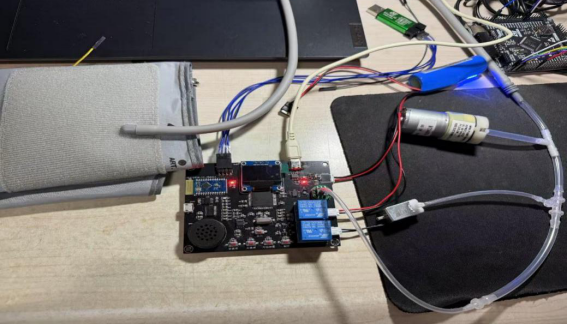 后续的代码调试工作将在这块焊接好的PCB板上进行,直到能测量并显示出较为准确的血压脉搏值。目前已经有部分功能能够实现,包括按键功能、充气泵与泄压阀的定时开闭、OLED的显示等。下图展示的是血压脉搏计的硬件连接图: