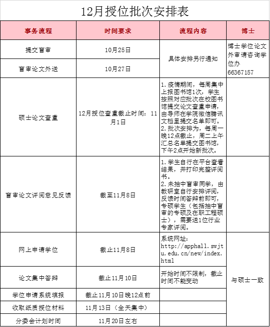 统一收取纸质版授位材料的具体时间为:11月13日。硕士、博士答辩及授位所有工作正常进行,(图书馆查重、论文外审、提交答辩及授位申请等环节全部采用线上完成,具体操作方式见下面各部分详情)。