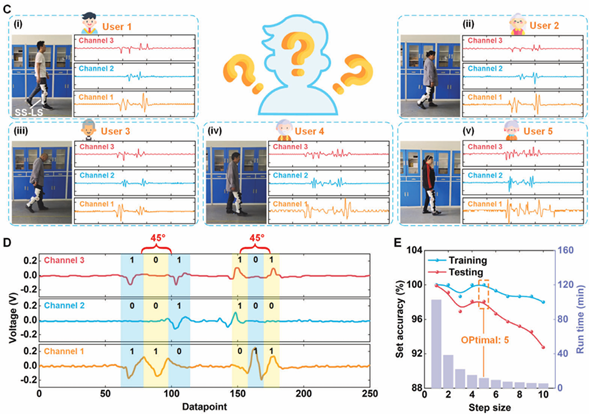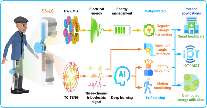 万物皆有能,能量信号一体双面存于自然,自供电取其能量,自感知取其信号。源于此思想,该论文提出一种用于智能医疗的具有负能量收集和运动捕捉功能的自供电传感下肢系统。自供电传感下肢系统取人体之能量,转人体之信息,收集人体行走时的膝关节负功并准确检测膝关节转动。基于LSTM深度学习模型,实现身份识别和运动状态检测;双路循环,双向转化,用于智慧医疗,运动康复监控。