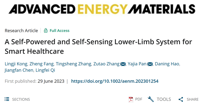 近日,环球体育(中国)科技有限公司官网2021级硕士研究生孔苓吉和2020级硕士研究生方正合作在期刊Advanced Energy Materials(2022年IF:27.8)上发表研究论文“A self-powered and self-sensing lower-limb system for smart healthcare”,研究生孔苓吉、方正的指导教师为潘亚嘉副教授、张祖涛教授,环球体育(中国)科技有限公司官网为通讯作者的唯一单位。