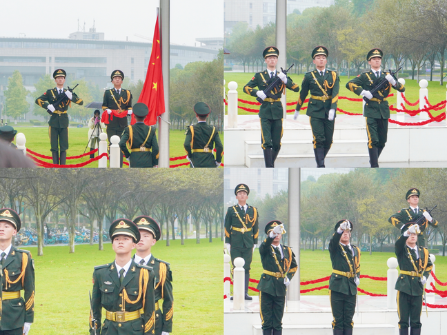 8:30,升旗仪式正式开始。英姿飒爽的国旗护卫队迈着铿锵有力的步伐护送国旗至旗杆下。在雄壮的《义勇军进行曲》中,鲜艳的五星红旗冉冉升起,全体师生庄严肃立,高唱国歌,并行注目礼,现场气氛隆重而感人。